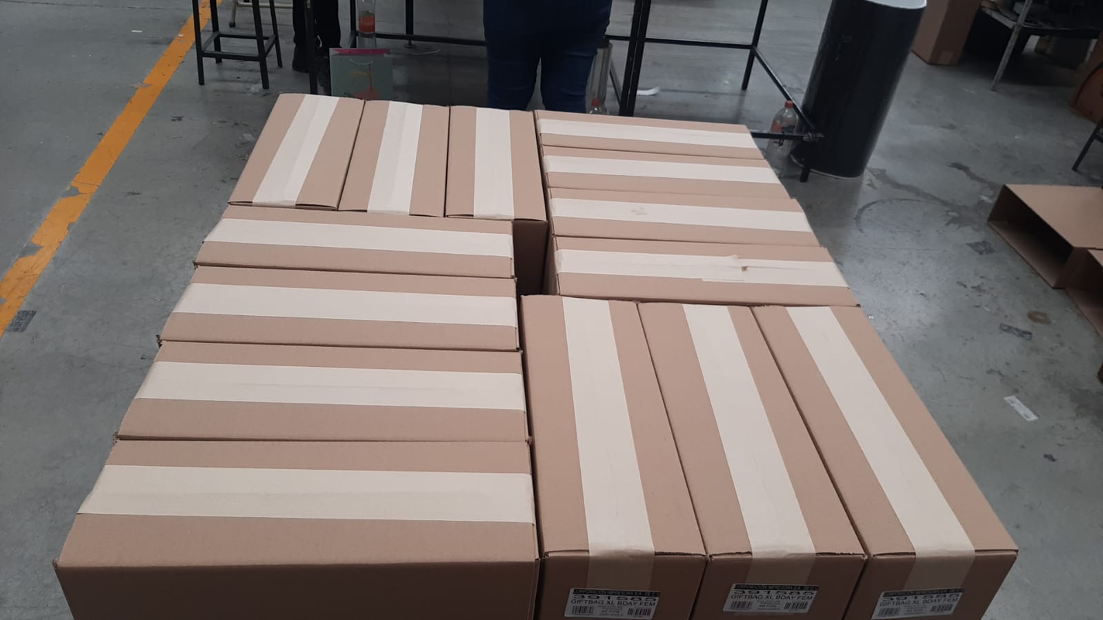 Las bolsas que ya fueron pegadas son acomodadas junto a las máquinas para ser perforadas de los ojillos y